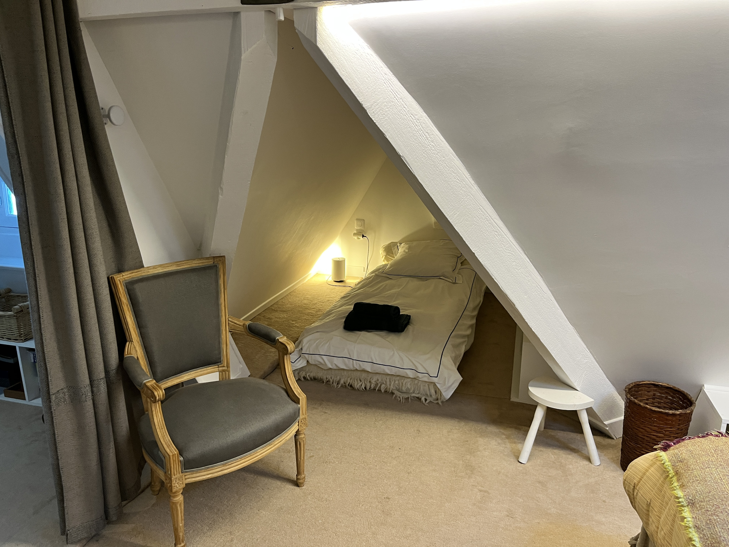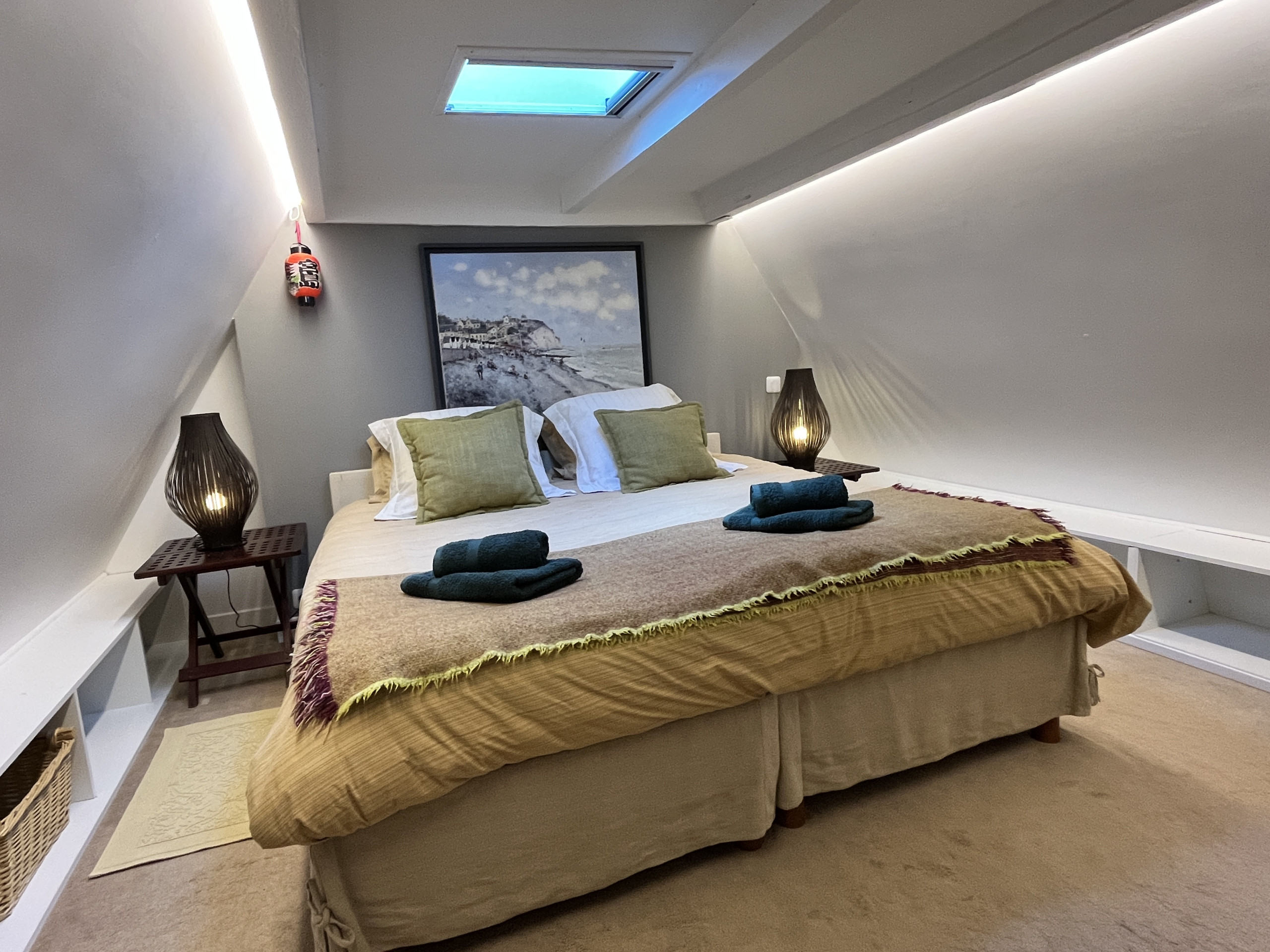 À l’étage, deux jolies chambres, dont une avec vue sur le ciel. Ces 2 chambres disposent sur le palier d’une autre salle de bain avec douche, wc et lavabo.