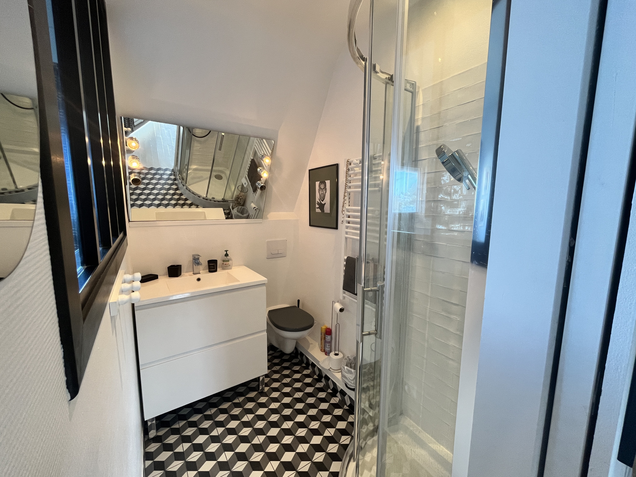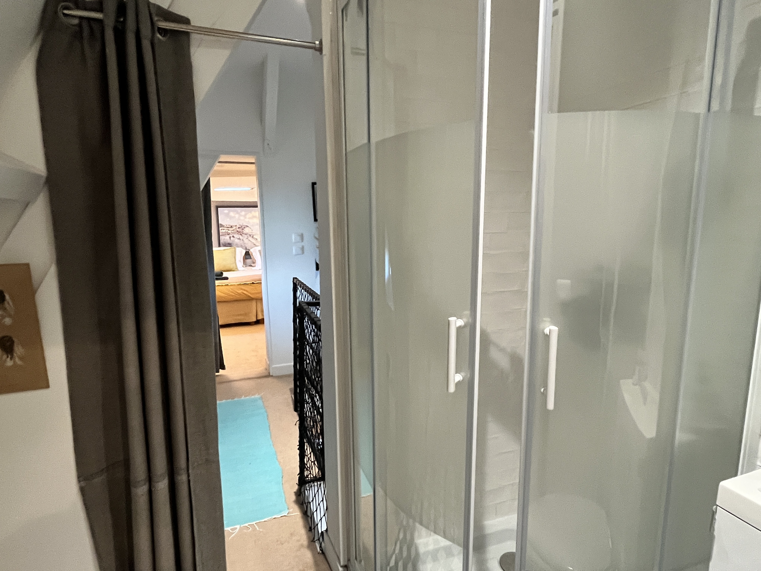 Une jolie chambre et sa salle de bain privative (douche, wc, lavabo) avec verrière est également desservie par cette entrée.